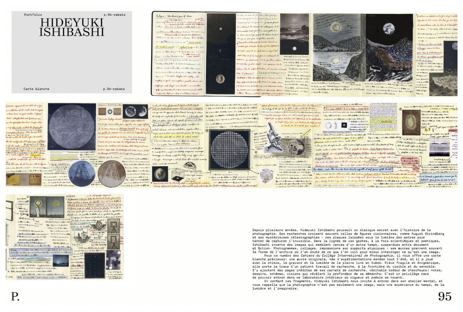 On y découvre également un atelier en urbex entrepris dans la maison de l'inventeur Daguerre avec les étudiants de l'école Duperré, et un récit inédit de la romancière Hélène Gaudy, inspiré des archives d'une mission scientifique au Svalbard. Ce premier numéro s'enrichit d'un questionnaire de Proust auprès des membres de l'Association des tireurs professionnels de photographie (Guillaume Geneste, Jean-François Bessol, Bati, Camille Loubeyre et Diamantino Quintas). Une carte blanche exceptionnelle d'Hideyuki Ishibashi vient clore le numéro : en forme de tiré à part, une œuvre inédite, fruit d'expérimentations menées sous la lumière de la pleine lune de Suède, où résonnent les échos des célestographies de Strindberg.