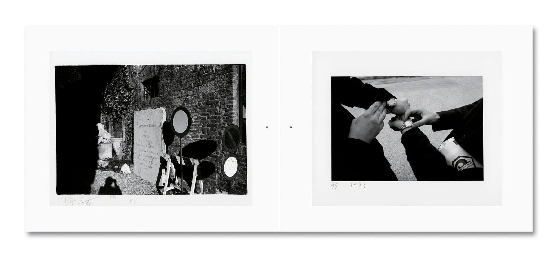 While sorting through his archive, Guido Guidi rediscovered negatives and prints from an intensely productive early phase. Shot on black-and-white film with small-format cameras, these photographs follow his everyday life in the 1970s—family and friends, colleagues at Venice’s University of Architecture—alongside more fragmentary, near-abstract views: solitary objects, shadows, symbols, empty streets. Their high contrast and off-kilter framing make them as graphic as they are documentary. Many still carry traces of earlier uses—faded captions, smudged notes, and the marks of past sequences.