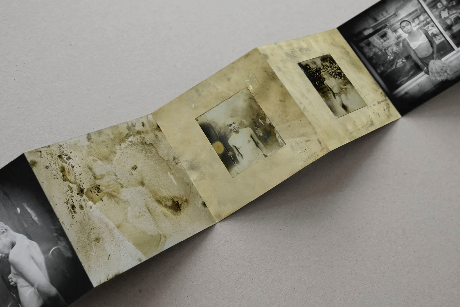 A distinct element of the book lies in its use of test strips — photographic leftovers from the printing process, left soaking for weeks in chemical solutions. Once dried, they bear marks of decay and transformation, ghostly echoes of the original image. In the book, reproductions of these spectral fragments are woven like relics of a memory in flux — imperfect, beautiful, and haunting — and each is carefully torn and glued in by hand after the printing process. In one of the collector’s editions, an original, signed strip is also included as an additional piece.